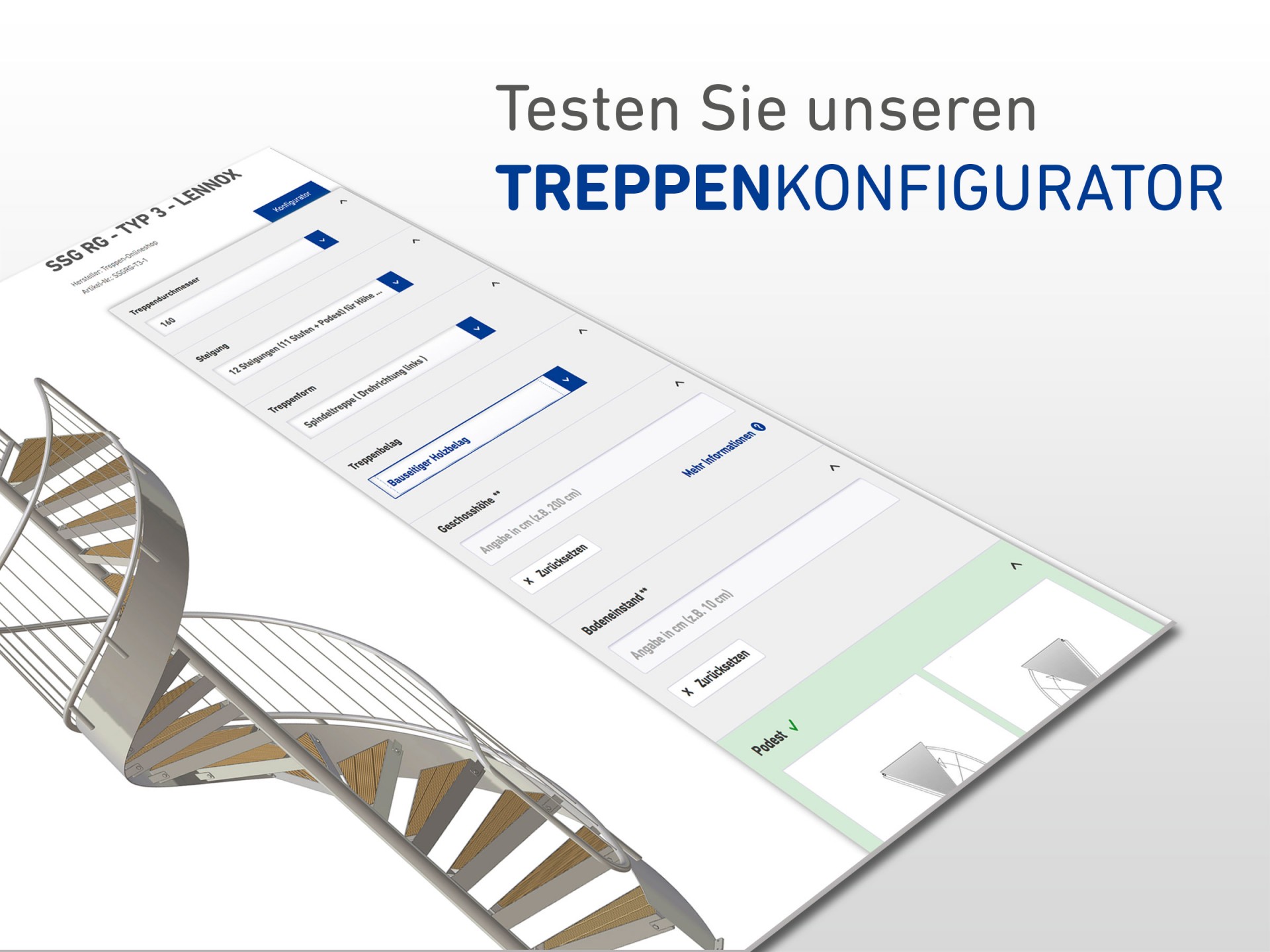 Der große Vorteil beim Kauf einer Treppe im Treppen Onlineshop: Mit Hilfe unseres Treppenkonfigurators können Sie die Treppe nach Ihren Bedürfnissen und Anforderungen gestalten. Wählen Sie individuell die Anzahl der Stufen, unterschiedlichen Treppenformen und vielen ansprechenden Belägen für Stufen und Geländer – so erhalten Sie Ihre ganz persönliche Treppe. Durch die individuellen Gestaltungsmöglichkeiten lassen sich die Treppen hervorragend in die unterschiedlichsten Stile sowie Gegebenheiten des Hauses integrieren.
