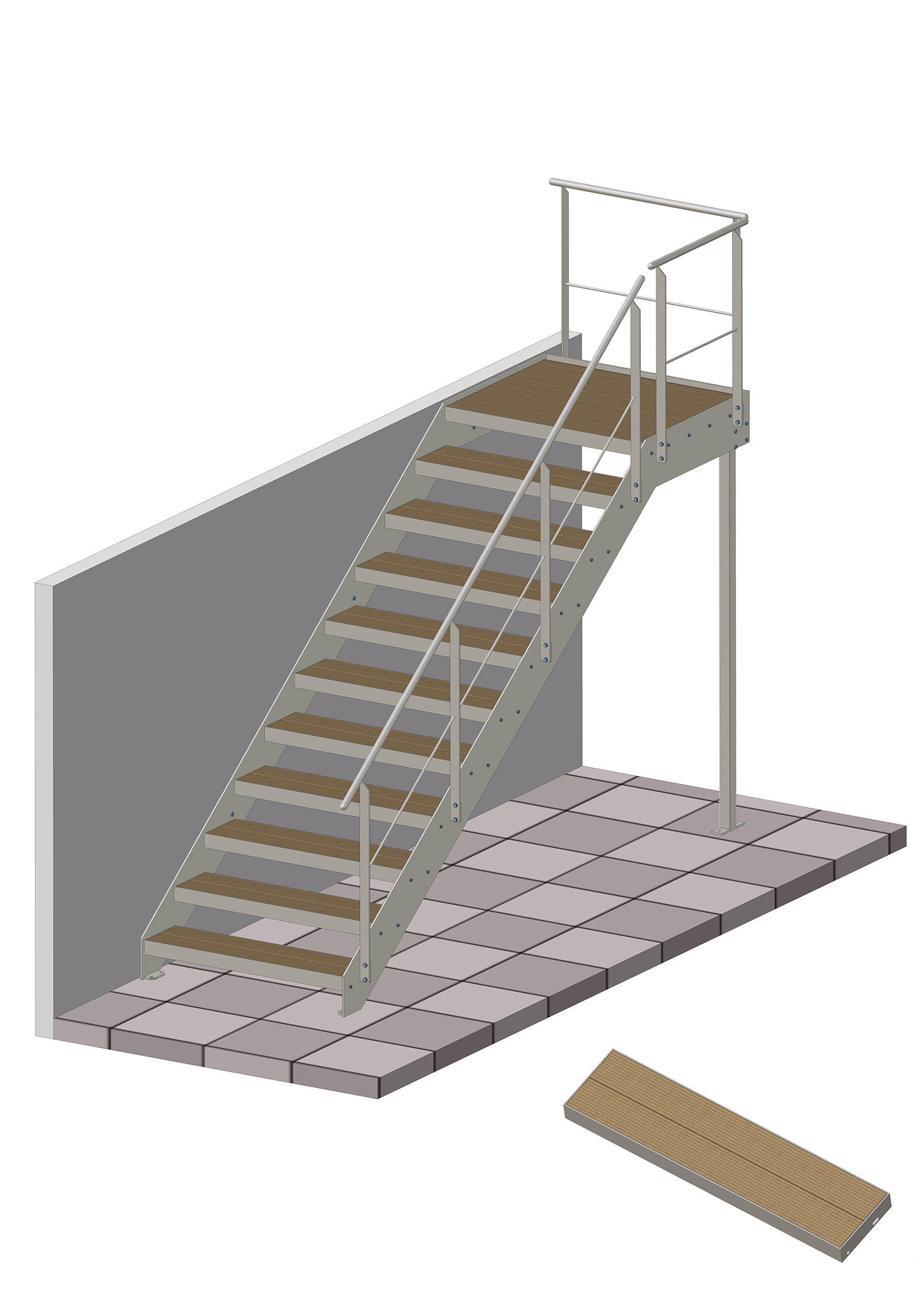 - Flachstahl – Wangentreppe mit 3 – 10 Steigungen inkl. Podest, freiseitige Stütze und einseitigen Geländer für eine Geschosshöhe von 52,5 cm – 210,0 cm.