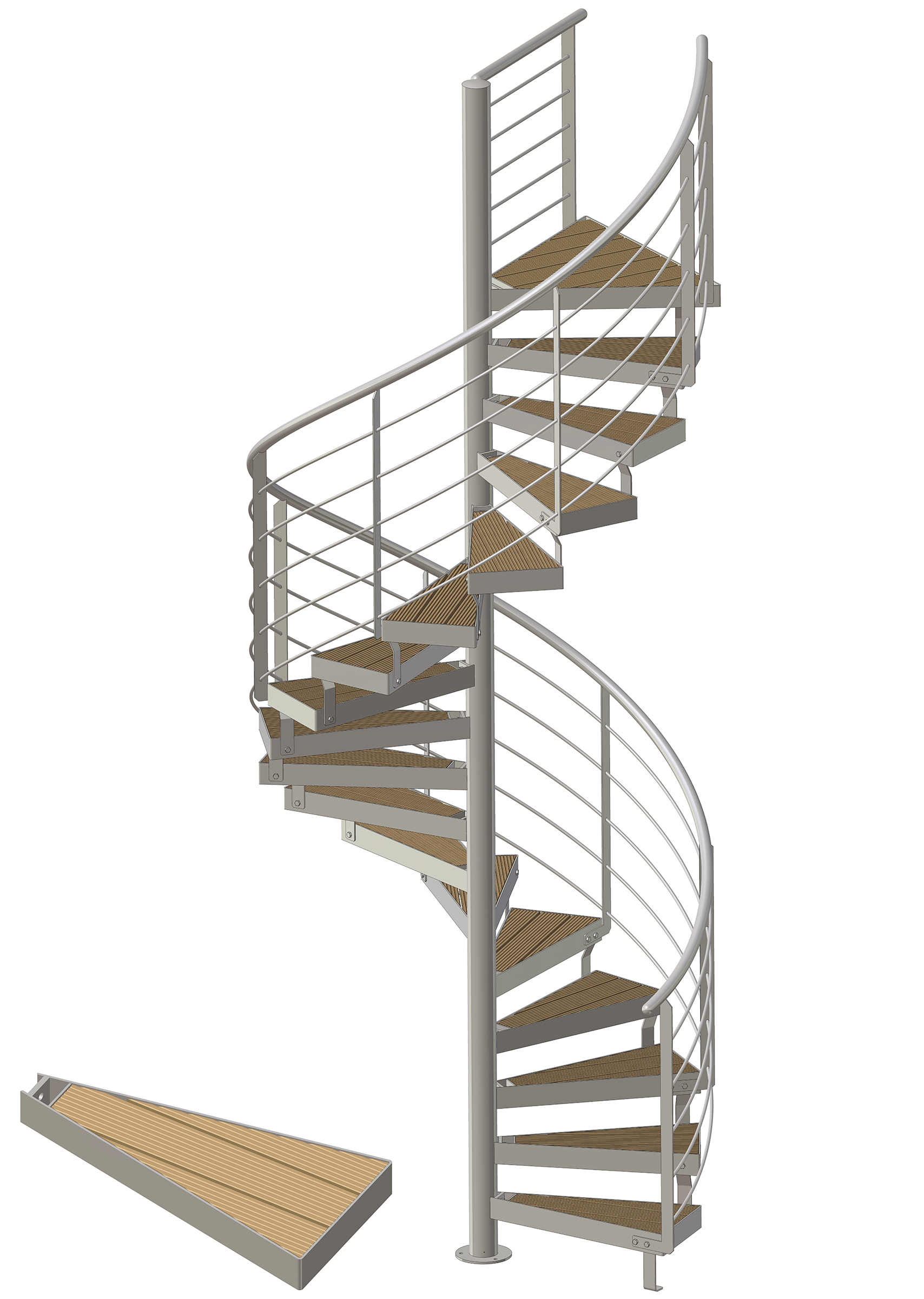 - Spindeltreppe mit 12 - 35 Steigungen (11 - 35 Stufen + Podest) inkl. Geländer für eine Geschosshöhe von 216 - 735 cm, feuerverzinkt