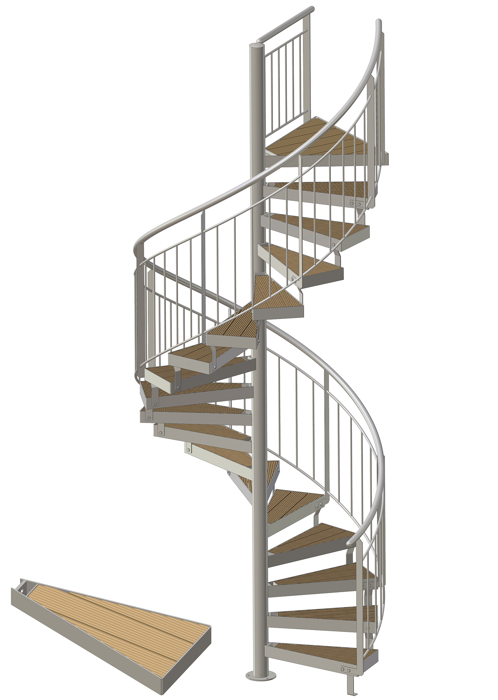 - Spindeltreppe mit 12 - 35 Steigungen (11 - 35 Stufen + Podest) inkl. Geländer für eine Geschosshöhe von 216 - 735 cm, feuerverzinkt
