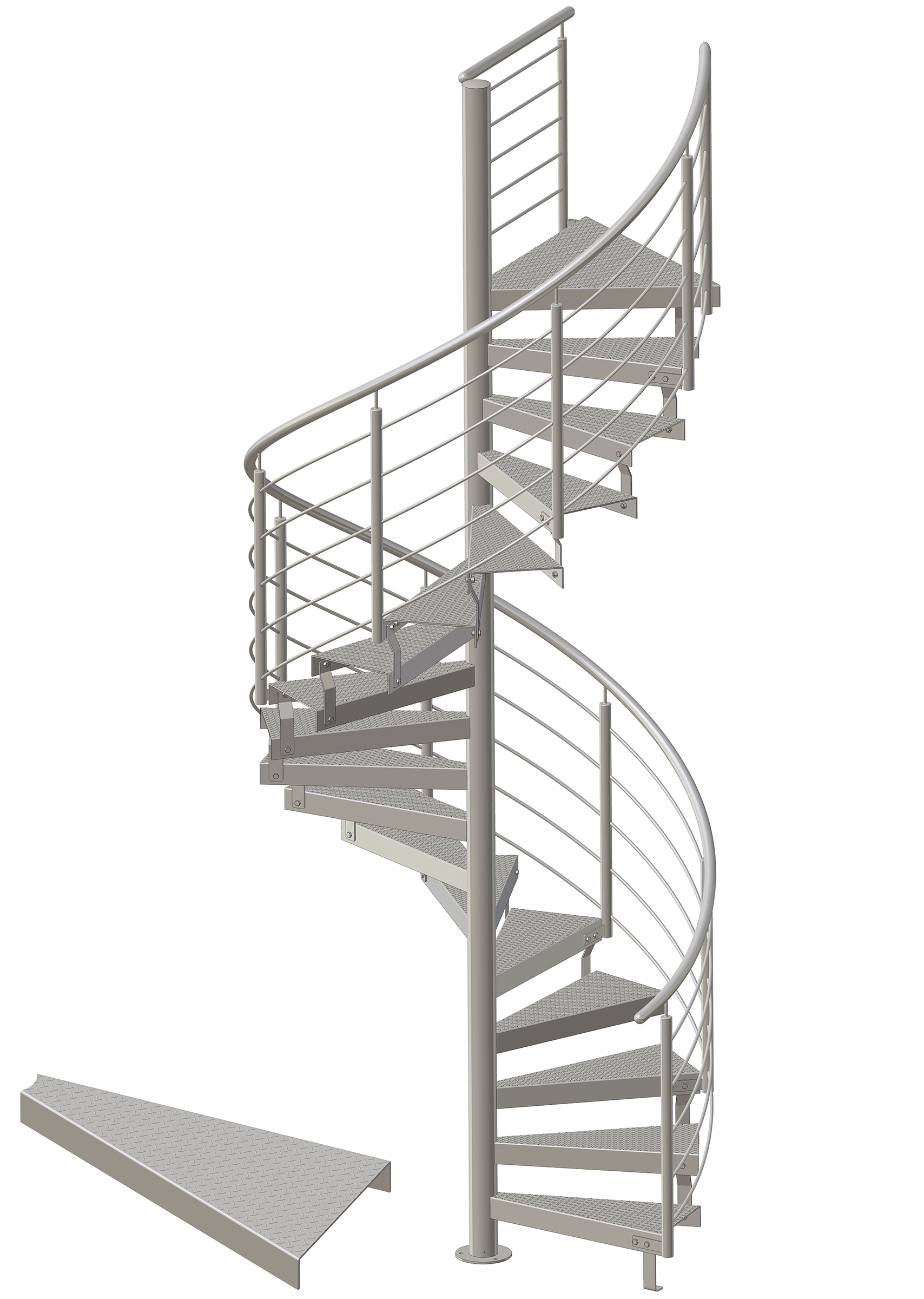 • Spindeltreppe mit 12 - 35 Steigungen (11 - 35 Stufen + Podest ) inkl. Geländer für eine Geschosshöhe von 216 - 683 cm, feuerverzinkt